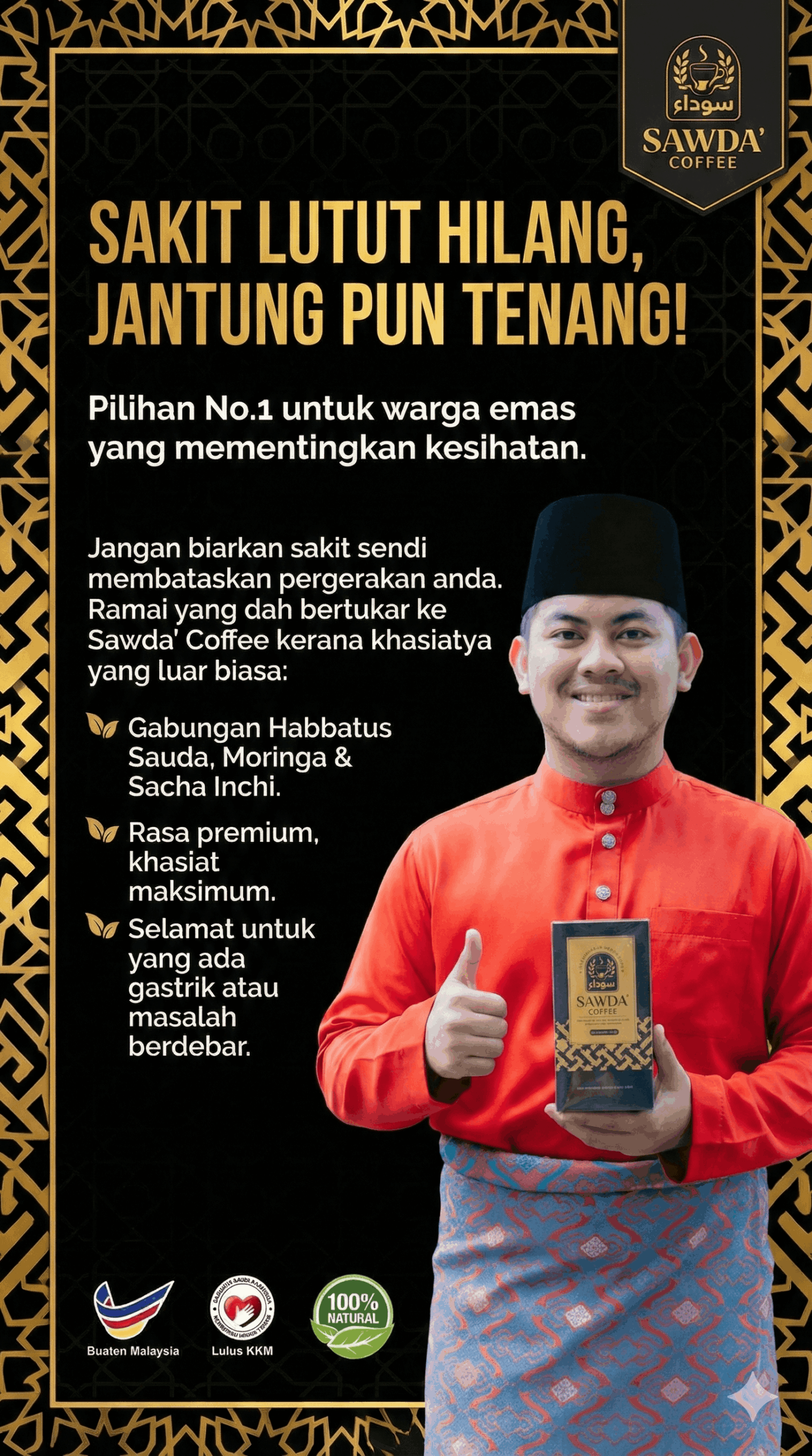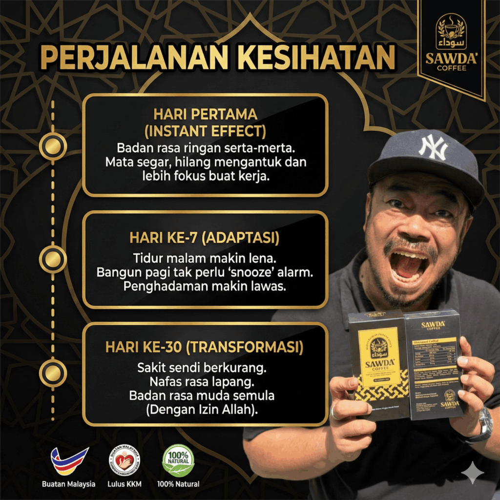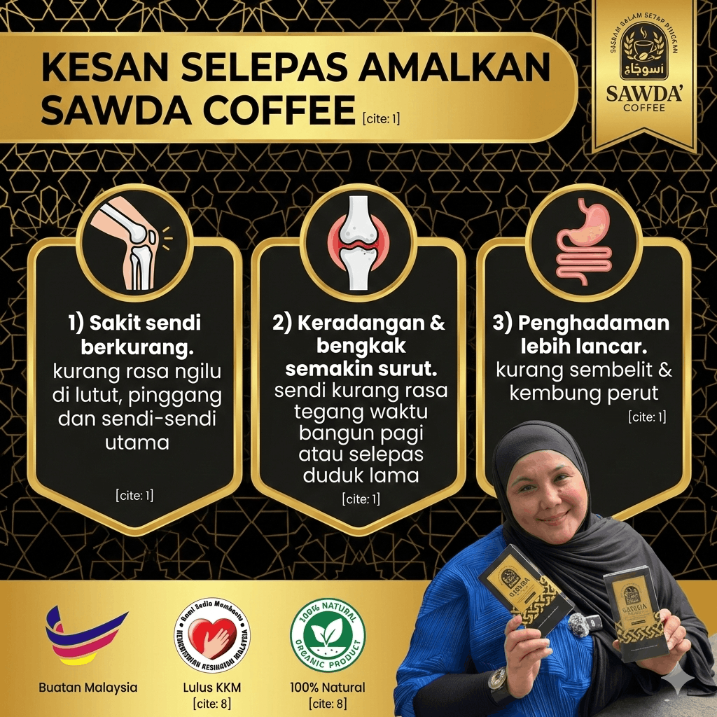 Kami pun rasa TAK LAYAK untuk terima BAYARAN jika kopi SAWDA ini langsung TAK MEMBANTU anda menghilangkan masalah penghadaman dan sakit sendi anda.